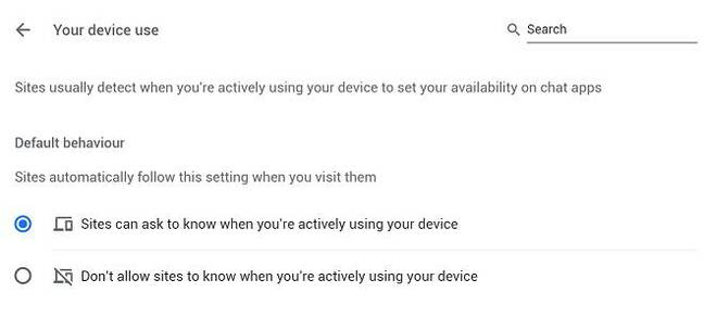 API обнаружения бездействия зависит от разрешения пользователя, которое можно найти в настройках Chrome 94. Пользователь может указать, разрешено ли сайтам запрашивать "информацию о том, когда вы активно используете устройство". Однако при таких настройках возникает опасение, что сайты могут попытаться принудить пользователя, заблокировать определенный контент, если разрешение не будет получено.