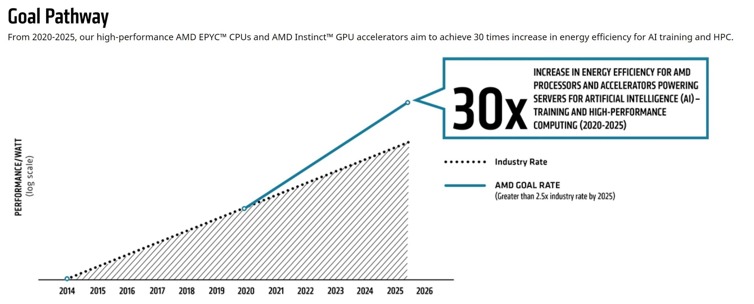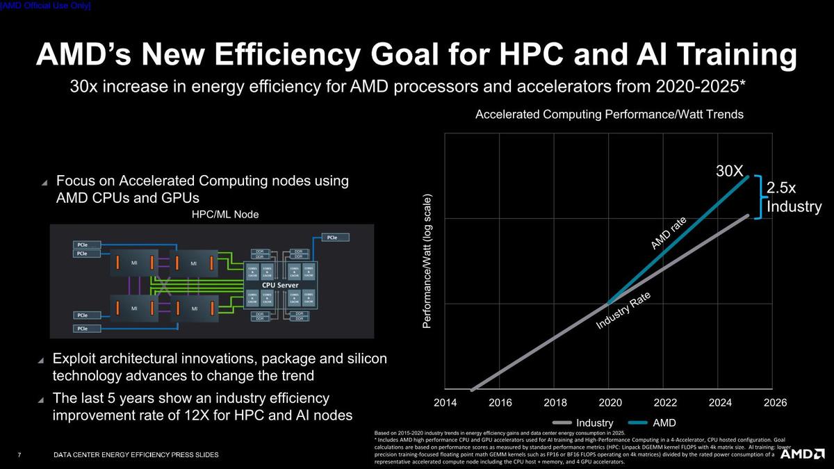 «Достижение повышения энергоэффективности процессора является долгосрочным приоритетом для AMD, и теперь мы ставим новую цель для современных вычислительных узлов, использующих наши высокопроизводительные процессоры и ускорители, применительно к обучению ИИ и развертываниям высокопроизводительных вычислений», - сказал Марк Пейпермастер, исполнительный вице-президент и технический директор AMD. «Сосредоточенная на этих очень важных сегментах и ценностном предложении для ведущих компаний по усилению охраны окружающей среды, цель AMD в 30 раз превосходит отраслевые показатели энергоэффективности в этих областях на 150% по сравнению с предыдущим пятилетним периодом».