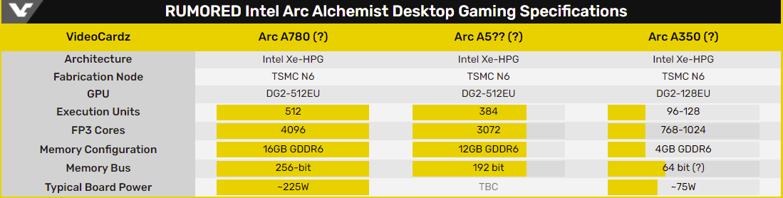 Согласно маркетинговым материалам Intel, семейство дискретных графических процессоров Arc Alchemist (также известное как DG2) будет включать два чипа, но согласно драйверам Intel, количество моделей может достигать 32 штук. Предполагается, что Intel первоначально предложит две модели: одну с 512 исполнительными модулями (EU) и 16 ГБ памяти GDDR6, которые будут предлагать производительность, сравнимую с GeForce RTX 3070/3070 Ti, а другую с 384 EU и 12 ГБ DDR6 с производительностью, сравнимой с GeForce RTX 3060/3060 Ti.