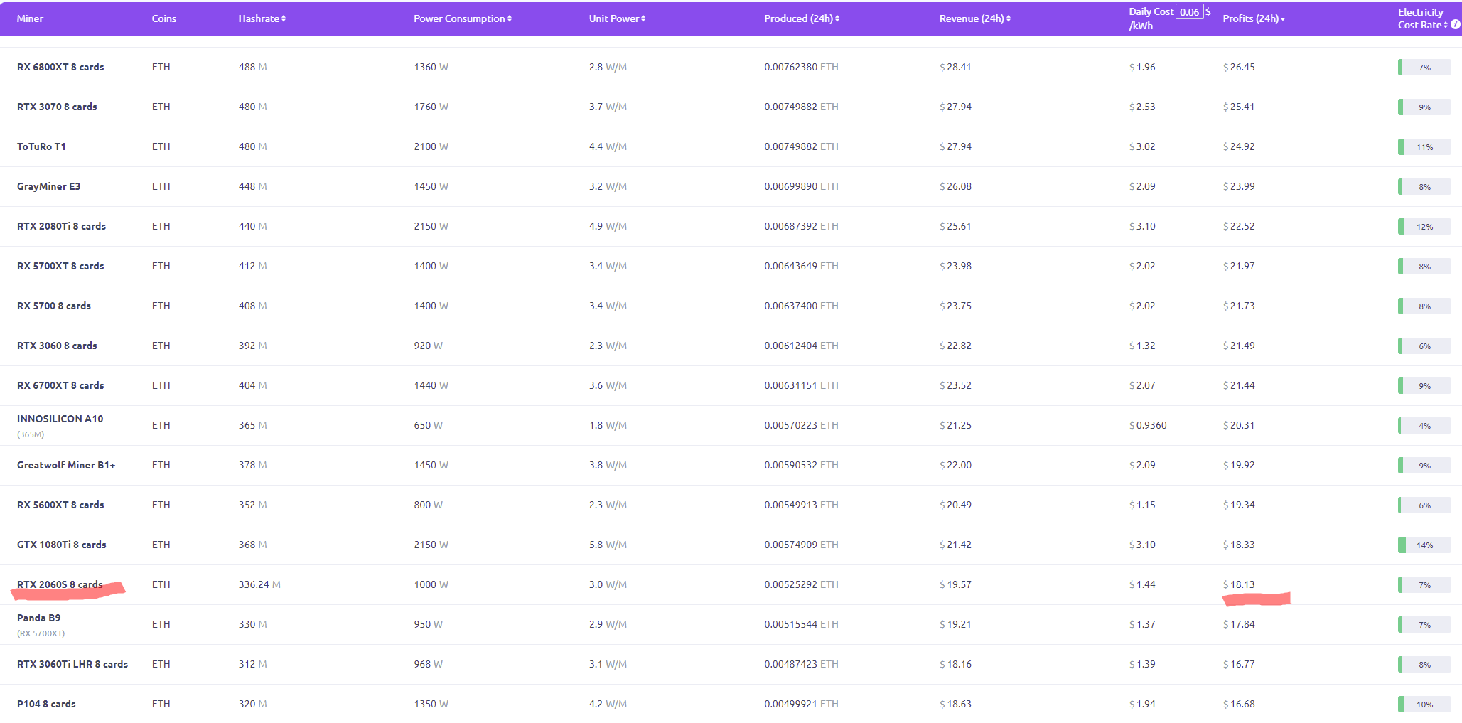Предположим, что вы купили 8 видеокарт GeForce RTX 2060 SUPER, заплатив за всё это 700 00 рублей (87 тысяч за единицу). Поскольку полноценная ферма из таких видеокарт выдаёт 18.13 доллара в сутки, то за месяц можно заработать 562 доллара, что равняется 42 тысячи рублей. Получается, что отбить ферму, в которую мы вложили 700 тысяч, можно за 16.6 месяца. Мы не говорим, что это удачная инвестиция, но сегодня на рынке нет более выгодных видеокарт. GeForce RTX 3060 имеет блокировку хешрейта, поэтому не способна работать в полную мощь. Более дорогие заведомо неэффективны.