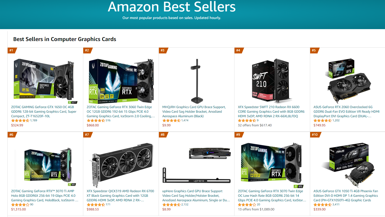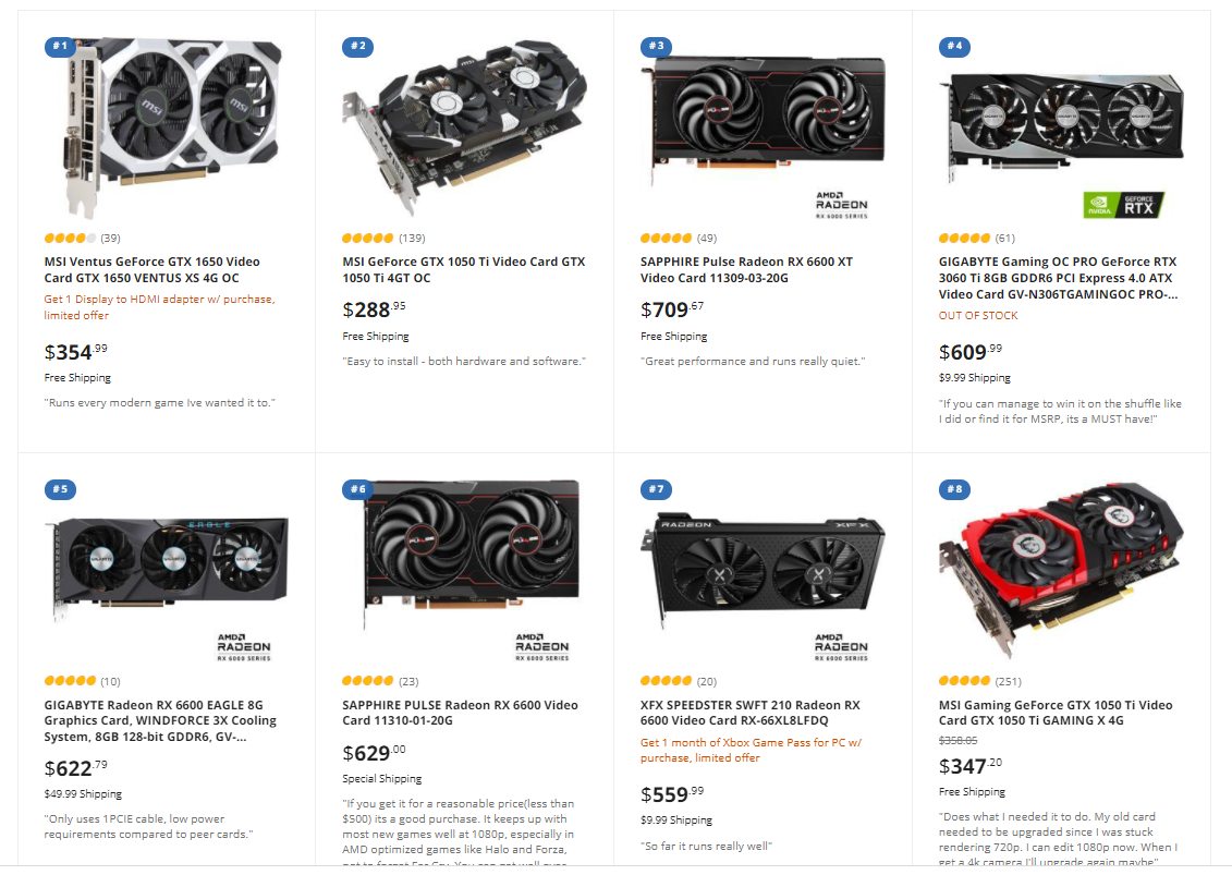 По данным журналистов портала Tom's Hardware, текущие рождественские праздники принесли невиданную популярность морально устаревшим графическим адаптерам GTX 1650 и GTX 1050 Ti. Маломощные видеокарты 2019 и 2016 года не просто пользовались популярностью у сборщиков ПК, а умудрились попасть на первые позиции в списке бестселлеров американских торговых площадок Amazon и Newegg, обогнав заметно более привлекательные новинки в лице RTX 3060 и Radeon RX 6600. При этом, цена обеих карт более чем в два раза превышает их рекомендованную стоимость на старте продаж, но даже это не остановило изголодавшихся геймеров.