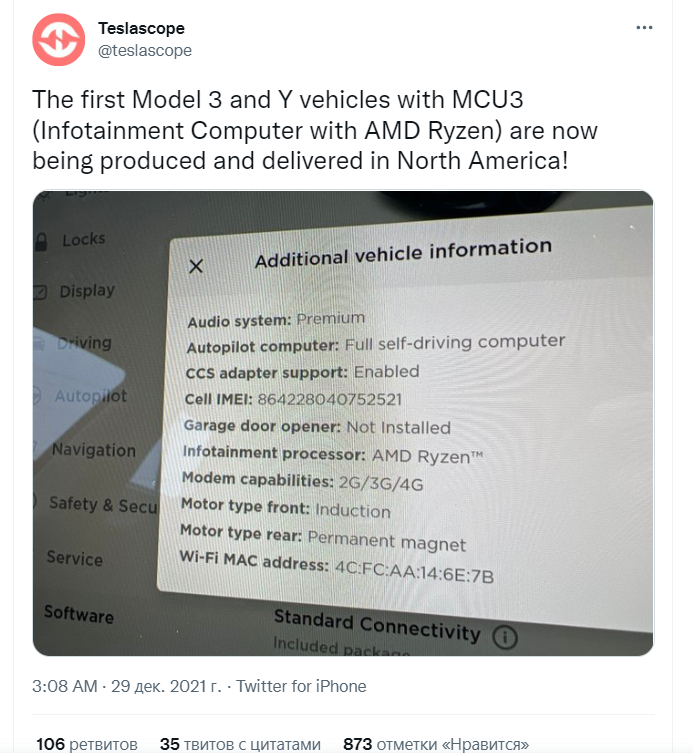 Ну а сегодня издание Tom's Hardware со ссылкой на пользователя социальной сети Twitter @teslascope сообщило, что встроенный компьютер обновлённых моделей электромобилей будет работать на базе 4-ядерного APU AMD Ryzen YE180FC3T4MFG с тактовой частотой 3,8 ГГц и 4 МБ кэш-памяти третьего уровня.