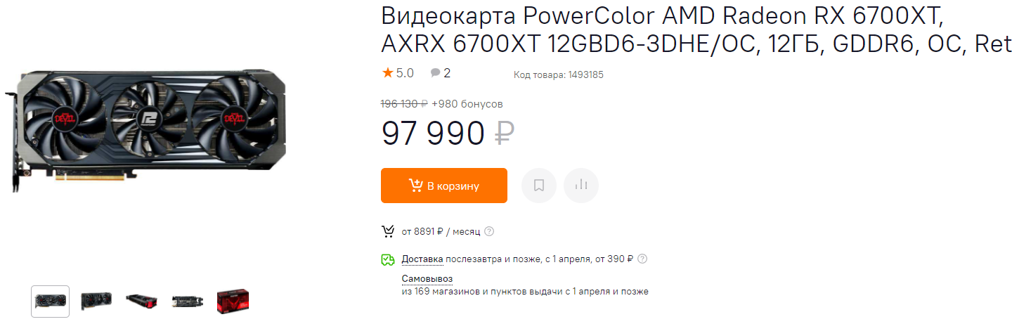 Самой быстрой видеокартой дешевле 100 000 рублей является Radeon RX 6700 XT. Это абсолютный чемпион с огромным потенциалом. Модель производства PowerColor получила отличную систему охлаждения, хотя и не является топовой. Никакого заводского разгона, но и цена здесь куда ниже, чем у всех остальных видеокарт на этом графическом чипе. Заметьте, по сравнению с серединой марта цена упала более чем на 100 тысяч рублей или более чем в 2 раза.