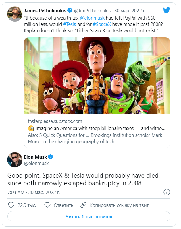 В своем сообщении Маск прокомментировал пост в блоге Петокукиса, подробно изложив аргументы экономиста Чикагского университета Стивена Каплана о том, что "и SpaceX, и Tesla потерпели бы крах в 2008 году, если бы Илону Маску пришлось выплатить 60 миллионов долларов из-за введения эквивалентного налога на миллиардеров".