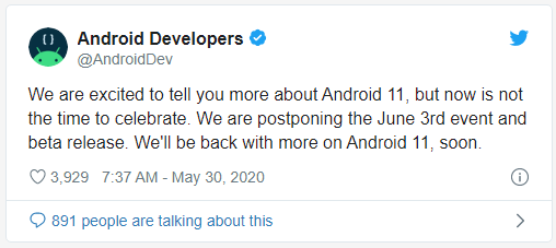 «Мы рады рассказать вам больше об Android 11, но сейчас не время праздновать. Мы переносим мероприятие, которое должно было пройти 3 июня и бета-релиз. Скоро мы вернемся с большей информацией об Android 11».