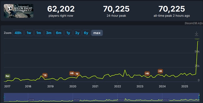 Как следует из статистики сервиса SteamDB, около двух часов назад в Hollow Knight через Steam играли свыше 70 тысяч человек. Для сравнения, все предыдущие годы данное значение не поднималось выше 20 тысяч человек, а в среднем болталось в районе 10 тысяч.