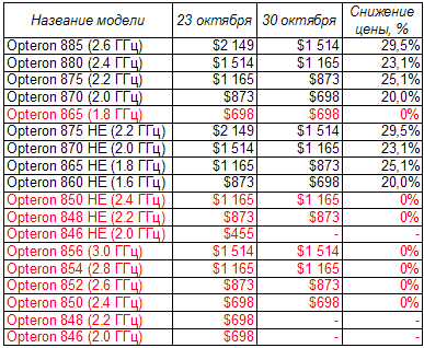 Прежде всего, AMD порадовала всех противников дискриминации: процессоры Opteron 1xxx и Opteron 1xx теперь не прячут свои цены за символами "*". Собственно говоря, цены на все процессоры Opteron были снижены в соответствии с прогнозами, поэтому переписывать весь прайс-лист мы не считаем нужным. Заострим ваше внимание лишь на тех позициях, которые не были отображены в прошлом прогнозе (выделены красным).