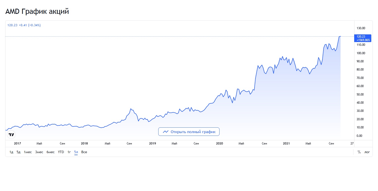 Доход компании в третьем квартале 2021-го года опять побил рекорд и составил 4313000000$, что на 51% больше аналогичного периода в прошлом году. Наибольшую прибыль, ожидаемо принесли, подразделения отвечающие за производство центральных процессоров и графических чипов. Росту доходов также поспособствовало увеличение отпускных цен на видеокарты и процессоры. В целом, с начала года, прибыль компании уверенно растет третий квартал подряд. Не отстает от прибылей и капитализация технологического гиганта. Начиная с 2018-го года акции AMD выросли более чем в двенадцать раз, с минимума в 10$ в апреле 2018-го до 120$ на текущий момент. Капитализация начала угрожающе приближаться к показателям синих, что не может не радовать - от острой конкуренции производителей всегда выигрывает конечный потребитель.