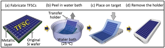 Процесс производства имеет технологическую особенность. Перед началом выращивания кристаллов солнечной батареи на кремниевую основу наносится слой никеля. Когда батарея готова, её помещают в водную ванну, в которой фотоэлементы отделяются от подложки в виде эластичной плёнки – это происходит в силу проникновения воды между кремнием и никелем. В финале, данная плёнка переносится на любую нужную поверхность, от корпуса мобильного устройства, до оконного стекла.