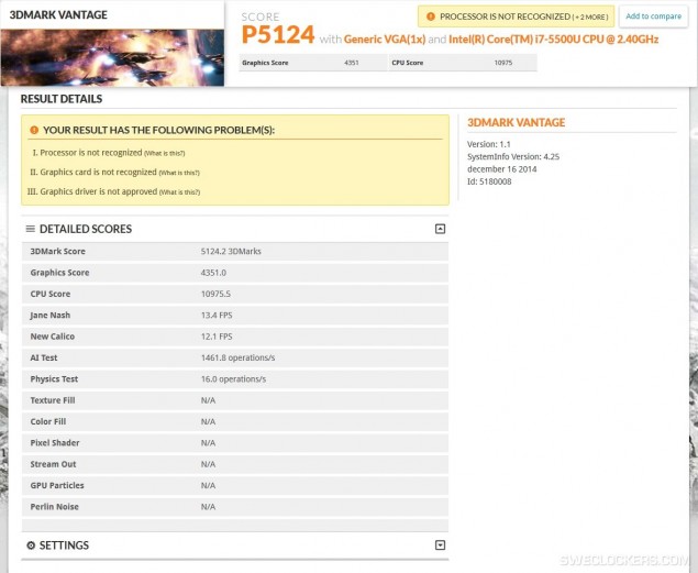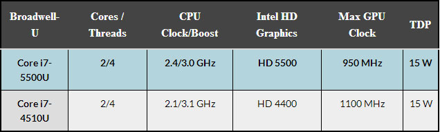 Сайт WCCFTech со ссылкой на шведский интернет-ресурс SweClockers сообщил, что коллеги смогли протестировать образец процессора Intel i7-5500U со встроенной графикой класса HD 5500. Результаты тестирования в бенчмарке 3DMark Vantage сравнивались с показателями процессора на основе Haswell — модели Core i7-4510U с графикой HD 4400. Сводная таблица с основными спецификациями обоих процессоров приведена ниже.