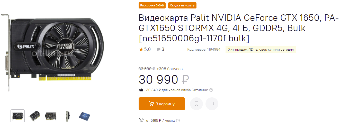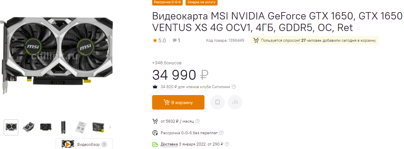 12 человек не пожалели 31 тысячу рублей на GeForce GTX 1650 производства Palit и 27 выложили 35 тысяч за чудо инженерной мысли MSI. Кстати, именно данный графический чип назван самым продаваемым в 2021 году. Российские геймеры явно беднее своих иностранных коллег, поэтому данная видеокарта не демонстрирует рекордных показателей. Несмотря на это, GeForce GTX 1650 имеет сбалансированные характеристики и позволяет играть во все игры на средних и минимальных настройках графики на народном разрешении 1080р. Пока на рынке нет ни одной модели, которая могла бы поспорить с GeForce GTX 1650 по соотношению цены и производительности.