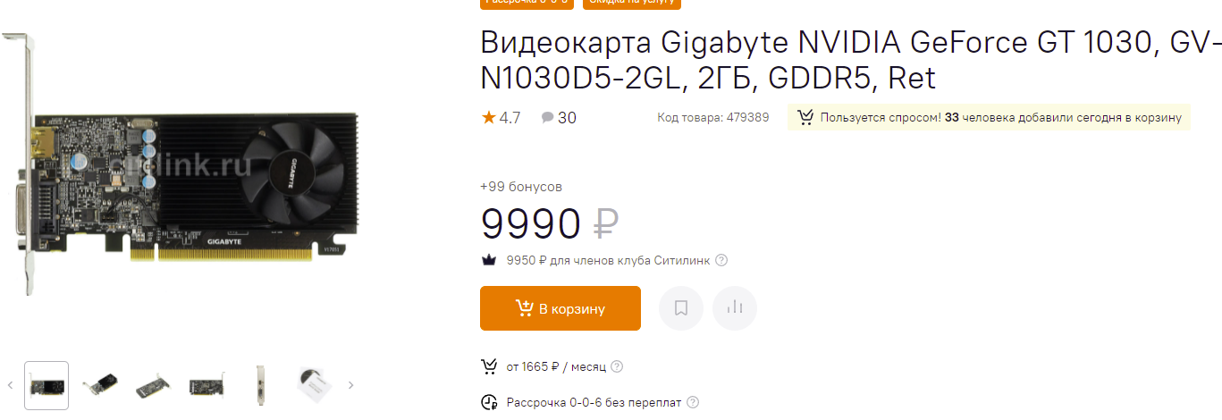 Беспрекословным победителем топа 31 декабря является GeForce GT 1030. В данном случае у нас самый настоящий компромисс между суперэкономией и бюджетной заточкой. Старая карта вполне сгодится для онлайн-шутеров и нетребовательных игр, но пасует перед новинками ААА-уровня. Если вы не хотите платить 31 тысячу рублей за GeForce GTX 1650, но планируете иногда запускать игры, то за какие-то 10 тысяч рублей у вас появится такая возможность.