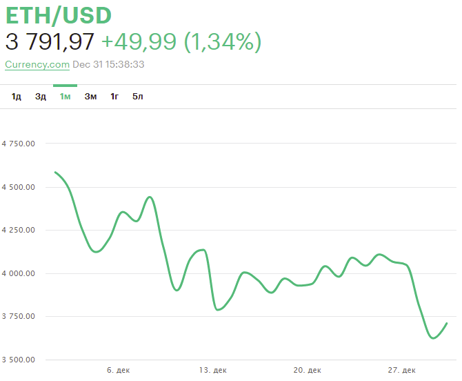 31 декабря Эфир торгуется на отметке 3800 долларов. Как мы могли убедиться, высокая сложность хешрейта сети не позволяет зарабатывать майнерам достаточно денег для возврата вложений в видеокарты, но такие тонкости не известны начинающим майнерам, поэтому даже сегодня многие из них продолжают скупать дорогостоящие графические чипы. Если верить аналитикам, то сегодня есть все условия для бычьего разворота, а цена Эфира может вырасти в ближайшие месяцы на 50%. Это значит, что уже в обозримом будущем вторая по популярности криптовалюта может подорожать до 6000 долларов.