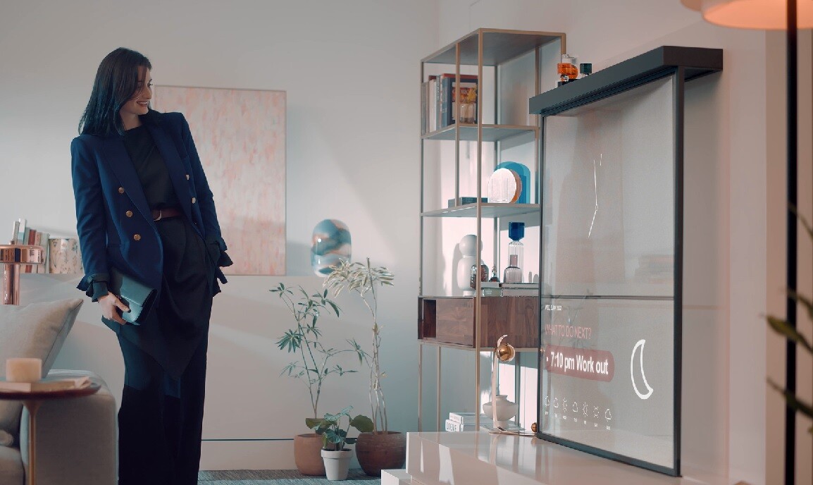 Последний проект, представленный на CES 2022, - стеллаж OLED Shelf, предназначенный для современного жилого пространства. Он включает в себя две прозрачные OLED-панели, сложенные одна над другой и расположенные под полкой, на которой пользователи могут разместить фоторамки или различные аксессуары. Компания предполагает, что владельцы домов будут использовать эти экраны для показа телевизионного контента или размещения цифрового искусства в непрерывном режиме, а на фотографии образца можно увидеть, что они также используются для различных оповещений и информировании о погоде. Хотя, по правде говоря, представленный здесь прототип выглядит немного громоздким и непрактичным.