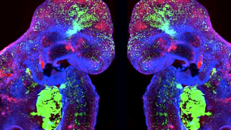 Развивающийся эмбрион химерной мыши, зеленым цветом показаны человеческие клетки. Научный институт Вейцмана