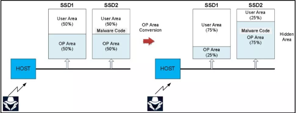 Это даёт злоумышленнику место на 2-м SSD для внедрения вредоносного ПО непосредственно в раздел OP, при этом для диапазона OP первого SSD устанавливается значение 25%, из-за чего создается впечатление, что область OP на обоих дисках осталась неизменной. Это связано с тем, что диапазон OP для обоих SSD вместе взятых по-прежнему составляет 50%.