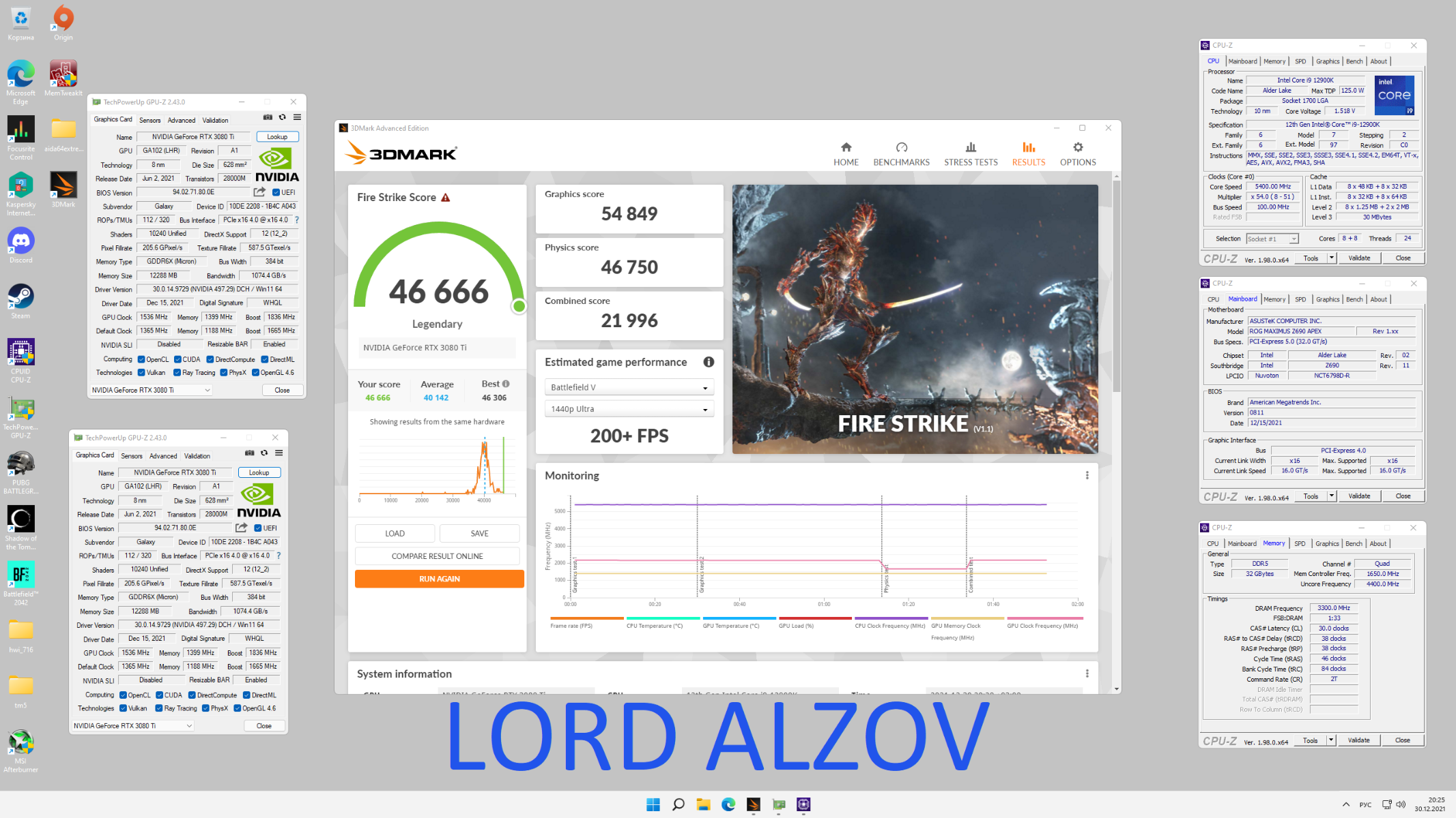 В 3dmark Fire strike Alzov уверенно обогнал немца использующего процессор 5950х на частоте 5360мгц охлаждаемый сухим льдом и набрал 46666 балов.