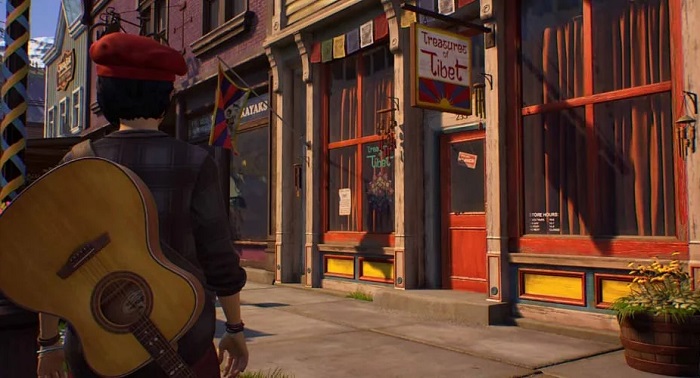 Увидеть соответствующий флаг можно в начале игры в сцене, где главная героиня, Алекс, гуляет по улицам вымышленного городка Хейвен Спрингс: одна из лавок, по всей видимости, сувенирных, носит название «Сокровища Тибета», а на висящей рядом вывеске и указан соответствующий флаг.