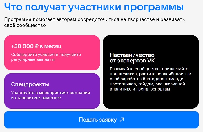 Ежемесячная выплата составит 30 тысяч рублей. Авторы также получат доступ к аналитике, тренд-репортам, гайдам VK и возможность участвовать в спецпроектах. Для участия в программе необходимо вести открытое сообщество с аудиторией от 1 до 100 тысяч подписчиков, иметь выраженный стиль и экспертизу в одной из заявленных тематик, создавать оригинальный контент в формате постов и клипов, а также зарабатывать не более 100 тысяч рублей в других программах монетизации ВКонтакте.
