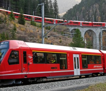Смотрите, как двухкилометровый электропоезд пробирается через виадуки и туннели в Швейцарих Альпах