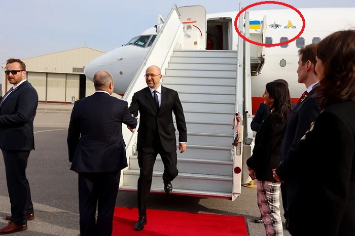 Как нетрудно заметить, на борту самолёта в виде незатейливого «ребуса» разместили наклейки в виде флага Украины, изображения истребителя, а также эмодзи со сложенными как при молитве руками. Естественно, журналисты этот примитивный ребус расшифровали как «Украина прилетела умолять об истребителях».