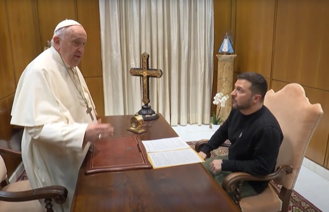После того как президент Украины Владимир Зеленский в феврале прошлого года сменил имидж и начал изображать из себя воинственного главу государства, которому ни к чему эти земные мелочи в духе деловых костюмов и различных правил этикета и протокола, стало очевидно, что он крепко вошёл в роль. Статус лиц, с которыми президент Украины проводит переговоры, его при этом совершенно не беспокоит: будь то функционер из Евросоюза, президент США, британский монарх или даже Папа Римский, который вообще-то считается ни много ни мало наместником Бога на Земле, глава украинского государства с любым из них будет выглядеть одинаково и вести себя примерно также.