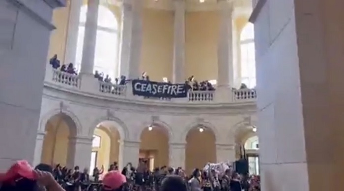 Здание Конгресса США, оно же Капитолий, последнее время стало желанной целью у тех, кто отчаялись докричаться до американских властей. Наивно предполагая, что подобная выходка обратит на себя внимание власти, группа протестующих, насчитывающая, по меньшей мере, двести человек, ворвалась буквально только что в здание Конгресса. Требование протестующих — прекращение огня в секторе Газа.
