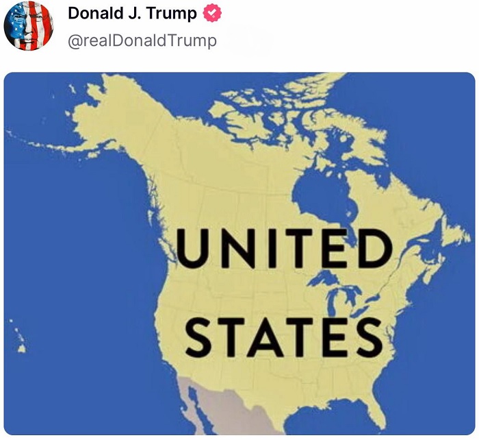 Сегодня, например, Трамп на своей официальной странице в собственной социальной сети Truth Social разместил картинку, на которой изображена территория Соединённых Штатов, включающая в себя всю территорию Канады вплоть до самых северных, арктических островов.